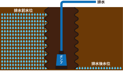 ディープウェル工法では、地盤に井戸を掘り、地下水位の高低差により井戸内に地下水を集め、水中ポンプで強制排水するという方法です。